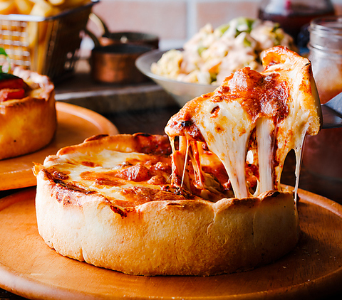店舗で発酵させる手作り生地をその場で焼きあげるシカゴピザがおすすめ。チーズをふんだんに入れ込んでチーズを伸ばして楽しもう!