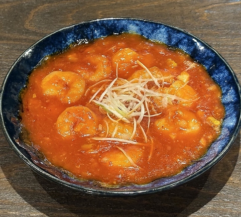丁寧に下ごしらえをしたぷりっぷりのエビを真っ赤なチリソースの中で泳がせています!