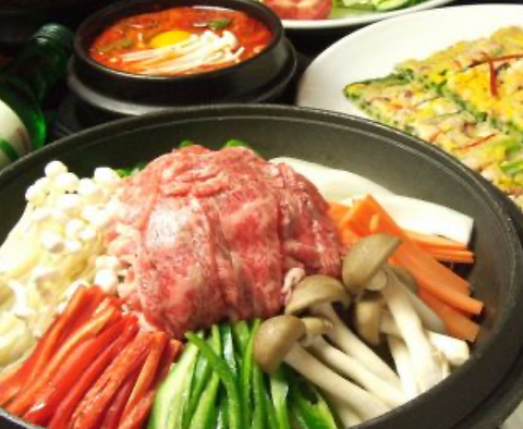 牛肉の出汁スープに、ソーセージや野菜、豆腐、キノコ、韓国モチ等が入った韓国定番鍋の1つ。女性男性限らず幅広い年代のお客様にお楽しみ頂けます。冬の寒い時期にはピッタリのあったかいお鍋です♪
