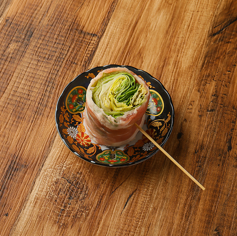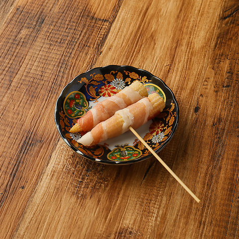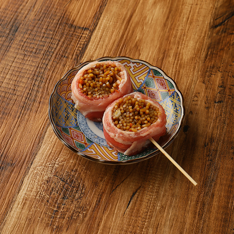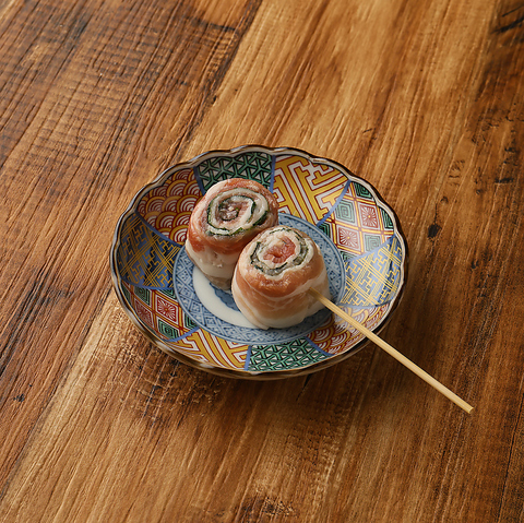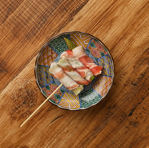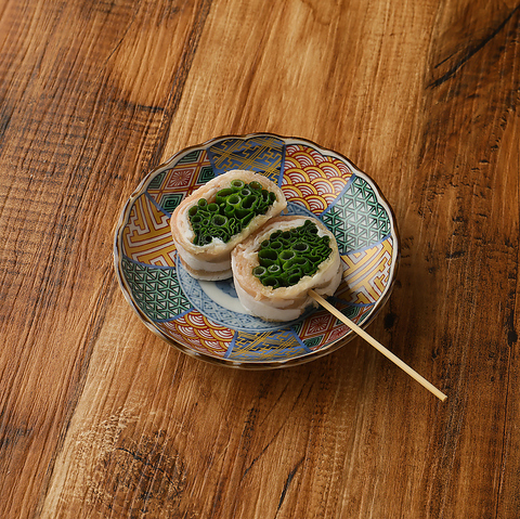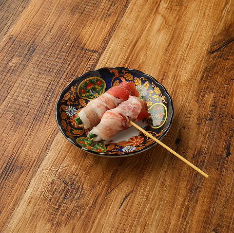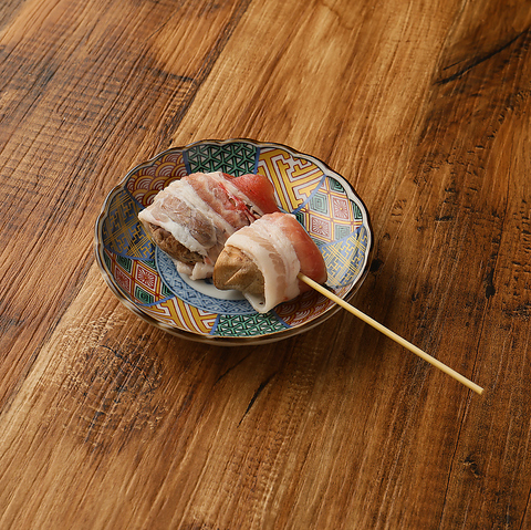 九州の大地が育んだ新鮮野菜を、博多で受け継がれてきた技で豚バラ肉にぎゅっと巻き込んだ、当店自慢の名物串。シャキシャキとした野菜の食感と、肉汁じゅわりの旨みが織りなすハーモニーは、一口頬張れば博多の活気がそのまま伝わってくるよう。塩・タレどちらでもお楽しみいただけます。