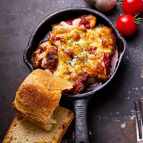 ガーリックベーコンポテトのチーズ焼き/エビのクリームアヒージョ+216円(税込)炭焼きチキンのHOTトマトアヒージョ(1辛)+216円(税込)/カルボナーラピザ+648円(税込)/マルゲリータ+648円(税込)/たらもピザ+540円(税込)/※ピザは2名様向けと3名様向けが同じ量になりますのでご了承ください。