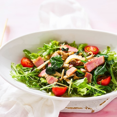 生ハムと半熟卵のシーザーサラダ(シーザードレッシング)+108円(税込)/チキンとコーンのサラダ(コブドレッシング)+108円(税込)/きのことベーコンのバターソテーサラダ(濃厚うまみクリーミーサラダソース)+108円(税込)/サーモンのカルパッチョ/旨辛よだれ鶏(3辛)+216円(税込)/エビの生春巻き(スイートチリ/1辛)/サーモンの生春巻き(スイートチリ/1辛)/生ハムとチキンの生春巻き(スイートチリ/1辛)
