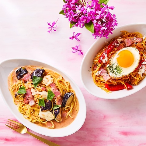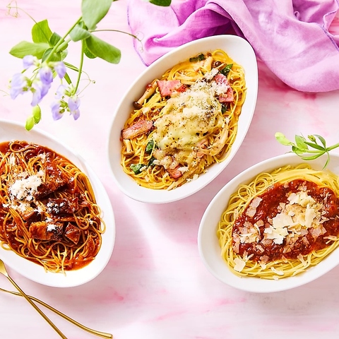 【トマト】イタリア産トマトのニンニク唐辛子(2辛)/ナスとモッツァレラのトマトクリーム/【クリーム】3種チーズのカルボナーラ/博多明太子クリーム/きのこのトリュフクリーム/【和風】ホタテときのことベーコンのバター醤油+108円(税込)/ほうれん草とベーコンのバター醤油/【オイル】エビとベーコンのジェノベーゼ+216円(税込)/ボンゴレビアンコ+108円(税込)/【ミート】牛肉のラグー+216円(税込)