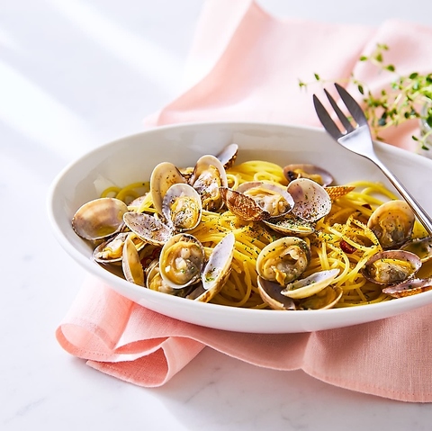 【オイル】ボンゴレビアンコ(1辛)1501円(税込)/【オイル】燻製ベーコンとフレッシュトマトのペペロンチーノ(2辛)1177円(税込)/【オイル】イカスミと博多明太子1609円(税込)/【オイル】エビとベーコンのジェノベーゼ1609円(税込)※画像はボンゴレビアンコ