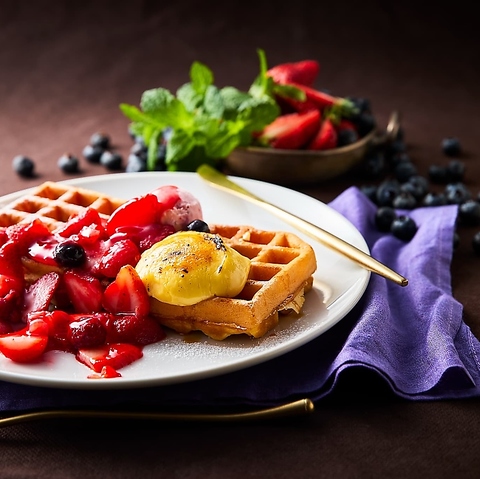 バターミルクアメリカンワッフルベリーキャラメルカスタード(店舗で焼き上げる、バターミルクアメリカンワッフル。芳醇な発酵バターの香りと卵の風味が口いっぱいに広がる、軽やかで優しい味わいのワッフルです。)961円(税込)/バターミルクアメリカンワッフルメープルクリーム745円(税込)/バターミルクアメリカンワッフルナッティーチョコバナナ961円(税込)※画像はバターミルクアメリカンワッフルベリーキャラメルカスタード