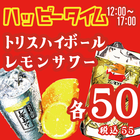12~17時迄はハッピータイム! トリスハイボールとレモンサワーがなんと50円◎