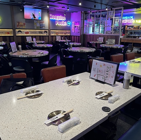 【ホンデポチャ 川崎店】店内では最新K-POPを楽しみながら美味しい韓国料理をお召し上がりください。韓国に来たような気分になれる店内で、デートや友人との食事にもみんなでワイワイ楽しみながら♪オシャレな店内で美味しい料理を食べて素敵な時間をお過ごし頂けます!