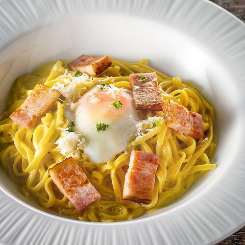 お店自慢のもちもち生パスタ(写真はカルボナーラ)