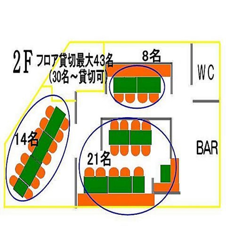 2階テーブル席25名様から46名様まで。様々なレイアウトでご利用頂けます。完全個室、貸切ですので他のお客様に邪魔されずお楽しみ下さい。ワイワイ楽しめます!