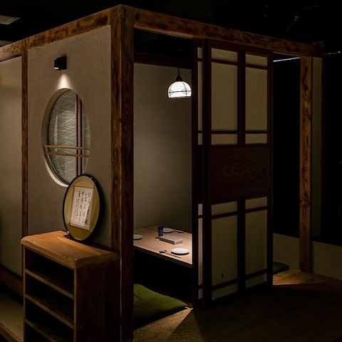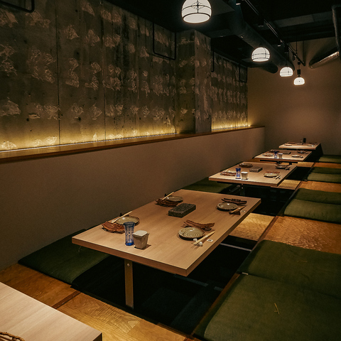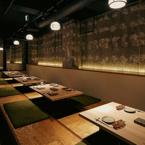 掘りごたつ席は、静かに和の趣が息づく上質な空間。畳の温もりとほの暗く柔らかな照明に包まれながら心をほどくようにゆったりとお食事をお楽しみください。