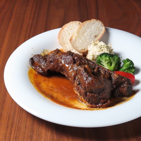 濃厚な赤ワインソースでやじっくり煮込み柔らかく仕上げています。見た目にも迫力満点な一品です。