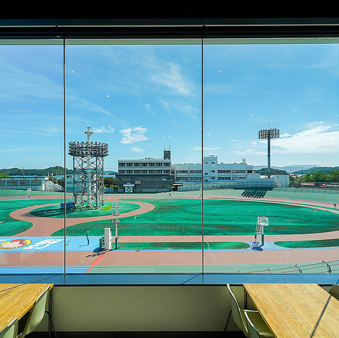 日本初 スタジアム一体型ホテル『KEIRIN HOTEL 10』内のレストラン。競輪場だけでなく、奥には瀬戸内の島々を望む絶好のロケーション。