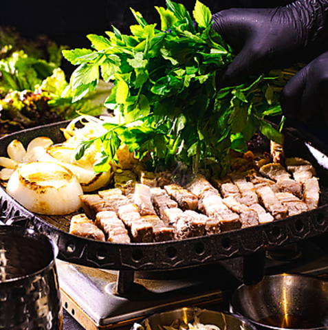 肉厚な豚肉を、斜めに傾いた鉄板でじっくりと焼き上げるサムギョプサルは、余分な脂が落ちてさっぱりといただけます!特製のつけダレやサンチュ、キムチなどと合わせれば、さらに美味しさが増します。韓国で人気のセリと一緒にいただく「ミナリサムギョプサル」もご用意しております◎