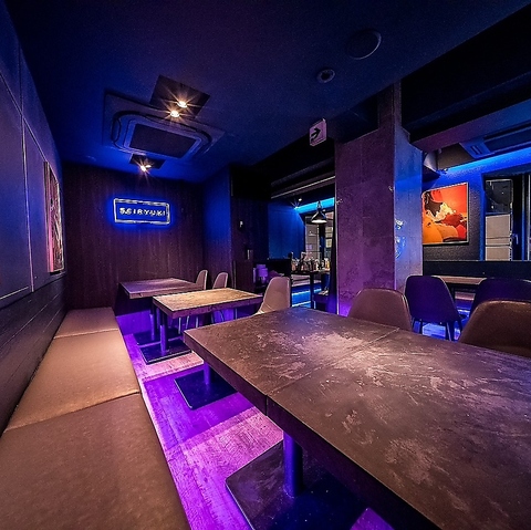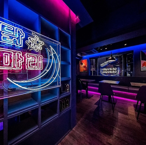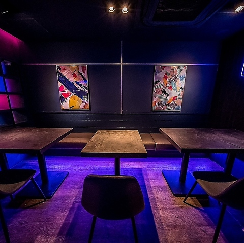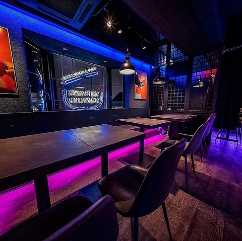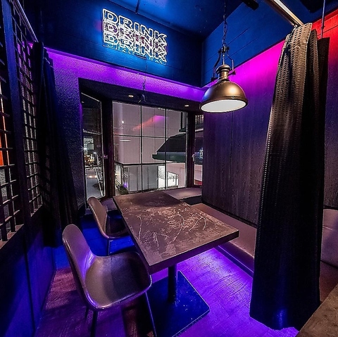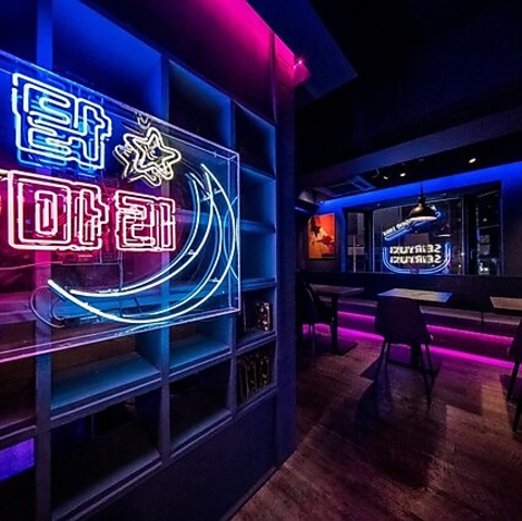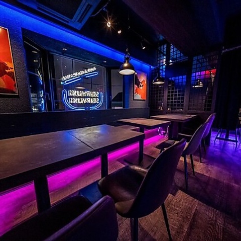 ネオンの光が煌めく、幻想的な雰囲気のテーブル席です。SNS映えする店内で、お食事とともに特別な時間をお楽しみください♪