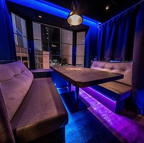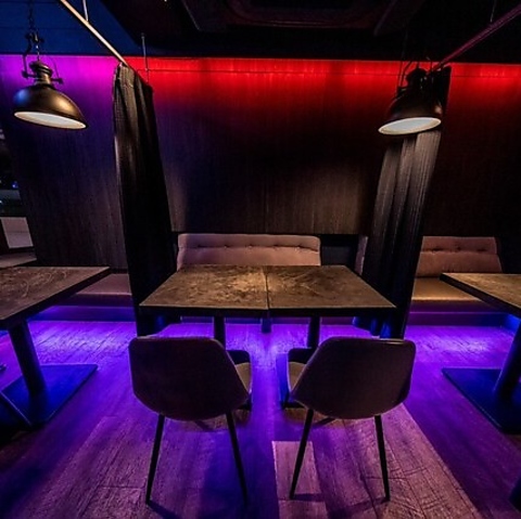 ネオンの光が煌めく、幻想的な雰囲気のテーブル席です。SNS映えする店内で、お食事とともに特別な時間をお楽しみください♪