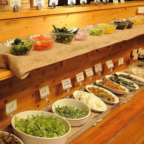 サラダ・お惣菜・ご飯・スープ・漬物おかわり自由!コスパ良し! 20品目以上のお野菜が並ぶカウンタービュッフェ。 日頃、野菜不足の方や健康志向の方など大歓迎♪ 満腹・満足していただける内容です!