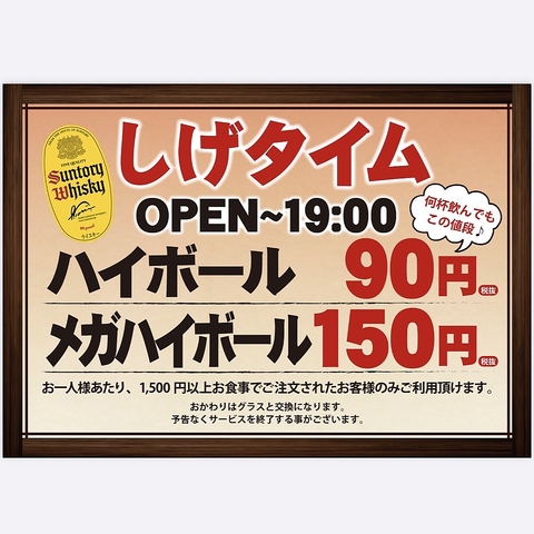~19時は角ハイボール90円・メガサイズが150円のハッピーアワーを実施◎平日・休日を問わず、毎日OK!!