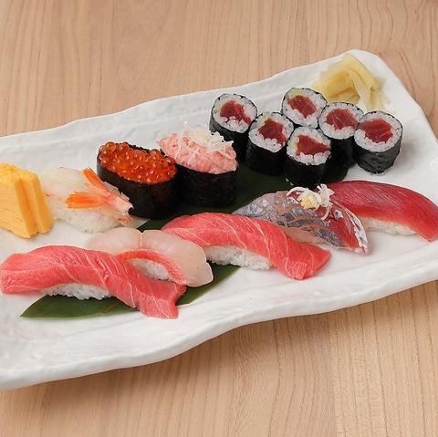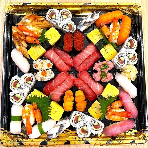 ・中とろ4貫・赤身4貫・白身4貫・えび4貫・玉子4貫・サーモン2貫・小肌2貫・いか2貫・穴子2貫・ウニ2貫・いくら2貫・ねぎとろ2貫・かにほぐし身軍艦2貫