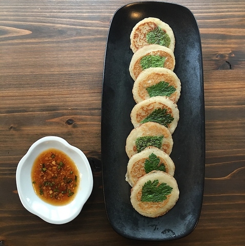 チヂミの生地は当店のオリジナルで配合しています。2~3種類の具材をたっぷり入れ、カリッと焼き上げます。具材はその時々によって変わります。*詳しくはスタッフまでおたずねください。