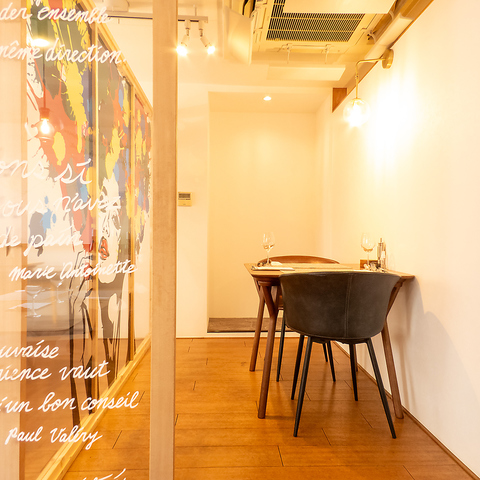 【2名様用の個室】カップル、ご夫婦、親友と。2人だけの素敵な空間を演出します。寛ぎつつも料理に集中できる空間づくりとなっており、フランスの下町レストランのようにお楽しみ頂けます。岡山県産食材を使用しおもてなし致します。※個室は全て仕切りかロールカーテンで個室となっております。(個室は電子タバコのみ可)