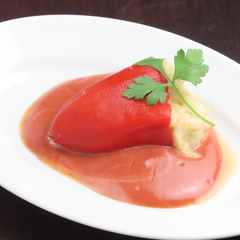 スペイン産の肉厚な赤ピーマンを炭火で香ばしく焼き、皮と種を取り除いた後、タラと海老のすり身を詰めました。さらに、パプリカと玉ねぎを使った濃厚なソースで仕上げ、深い味わいを引き立てました。