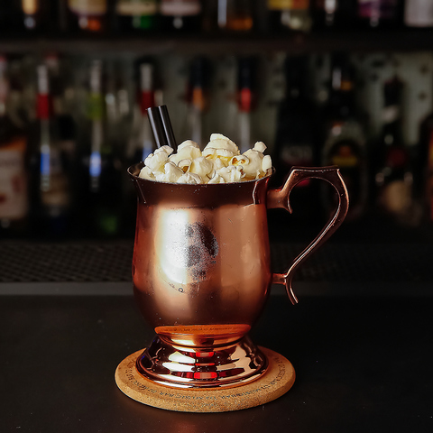 まるで映画のワンシーン!D2 Music Barがお届けする「ポップコーンラプソディ」。キンキンに冷えた銅マグから溢れるのは、山盛りのポップコーン!香ばしい香りと、リッチでクリーミーな甘い味わいが口の中で弾けます。今宵、当店でこの遊び心満点な一杯を片手に、楽しい夜の幕開けをお楽しみくださいませ。