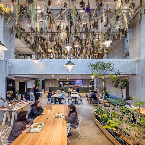 ビジネスホテルをリノベーションしたこだわりのおしゃれ空間。天井が高く、緑が豊かで開放的!