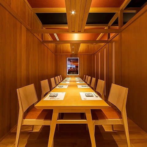 【テーブル個室】2~10名様の人数に合わせた形でご利用いただける個室をご用意しております。接待・会食など大事なビジネスシーンでのご利用にもおすすめです。落ち着きのある和モダンな空間で周りの目を気にすることなくお食事いただくことができる人気のお席です。