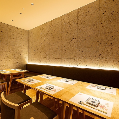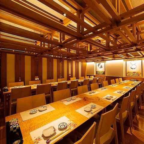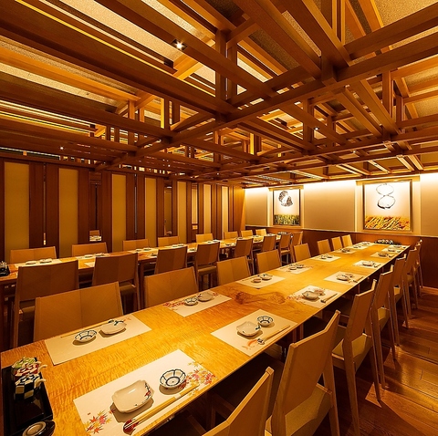 上質で落ち着いた和モダンな空間は飲み会や接待、会食におすすめです。お席はカウンター・テーブル席・2~4名様用の半個室を完備しております。職人による技で刺身・焼き・蒸しなど様々な調理法をお楽しみくださいませ。