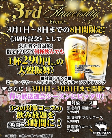 3月1日-8日までの8日間限定!《3周年記念》として来店者全員対象!指定ドリンク何杯飲んでも1杯290円税込の大盤振舞!
