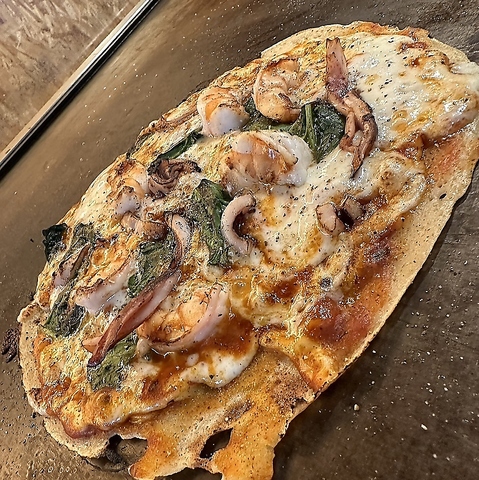 ■トマトマルゲリータ■ベーコンポテト■マヨコーン■シーフード お好み焼きの生地で焼きあげる鉄板酒場ならではの新感覚の特製ピザです。具材の旨みがダイレクトに感じられるます。こちらもシェアのしやすい人気な1品です