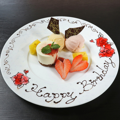 【ホットペッパーグルメ限定】バースデープレート500円でプレゼント♪クーポンご用意しております。記念日・誕生日のお祝いに是非ご利用ください。メッセージプレートは前日21時までの事前予約をお願いしております。ネット予約の際、ご希望のメッセージがございましたら30文字以内でご記載ください。