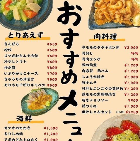 おばんざいの定番はもちろん、居酒屋メニューも豊富に取り揃えております。旬の野菜を使用したおばんざいや、一品料理も充実しております。お酒の肴にはもちろん、お食事にもピッタリなおばんざいもご用意しておりますので、お仕事帰りのサク飲みなど、様々なシーンでご利用ください。