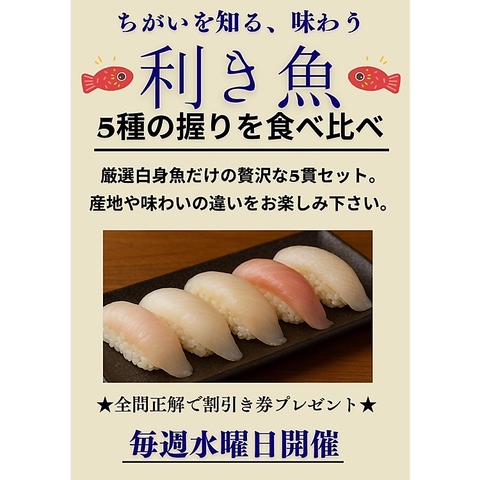 水曜日限定!”利き魚”~5種の握りを食べ比べ~厳選白身魚だけの贅沢な5貫セットをご用意いたしました!繊細な旨みと食感の違いを楽しめる、白身魚の奥深い世界へ。職人の技で引き出された旬の味わいを、ぜひ食べ比べてください。全問正解でお得な割引券もプレゼント♪皆さまのご来店を心よりお待ちしております。