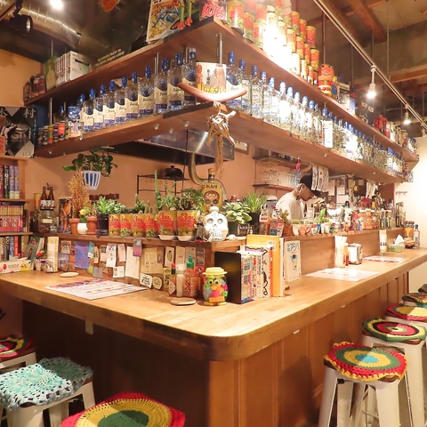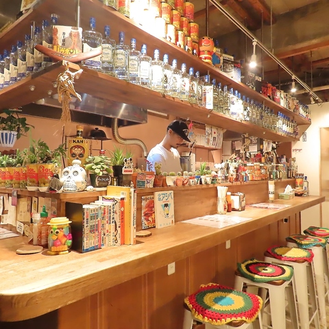 【ライブ感たっぷりのカウンター席】オープンキッチンのカウンター席は、おひとりさまで来ても楽しめるアットホームな空間♪テキーラやメキシコの地酒などが並ぶカウンター席では、スタッフとの会話も楽しむことが出来る特等席。会社帰りに「ご飯だけ♪」「ちょっと1杯♪」そんなおひとりさまも安心してご来店頂けます。