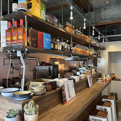 【ライブ感たっぷりのカウンター席】オープンキッチンのカウンター席は、おひとりさまで来ても楽しめるアットホームな空間♪テキーラやメキシコの地酒などが並ぶカウンター席では、スタッフとの会話も楽しむことが出来る特等席。会社帰りに「ご飯だけ♪」「ちょっと1杯♪」そんなおひとりさまも安心してご来店頂けます。