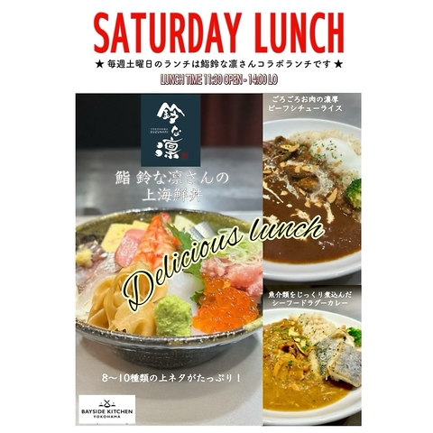毎週土曜日は≪鮨鈴な凛さんコラボランチ≫です。鈴な凛さんの極上の海鮮丼を特別価格でご用意!他にも魚介をじっくり煮込んだシーフードラグーカレーやごろごろお肉のビーフシチューライスなど土曜日のランチは特別限定ランチをどうぞ!