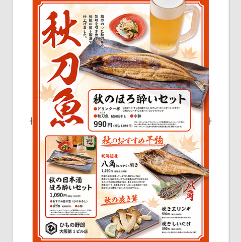 9月17日より、秋のおすすめ干物、秋刀魚と北海道産の八角(はっかく)を準備してご来店をお待ちしております。ひやおろしとともに秋刀魚を楽しめる「秋の日本酒ほろ酔いセット1,199円」や焼ききのこもございます。秋の滋味を味わってください。