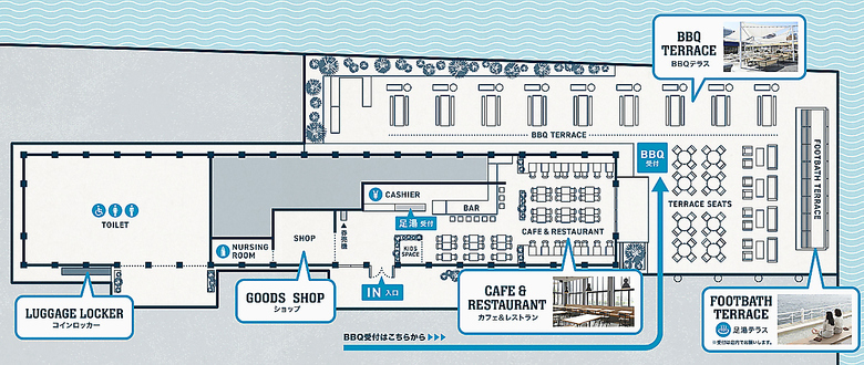 <BBQ>11:00~22:00(営業期間:3~11月)<足湯テラス>10:00~21:00<SHOP>10:00~19:00