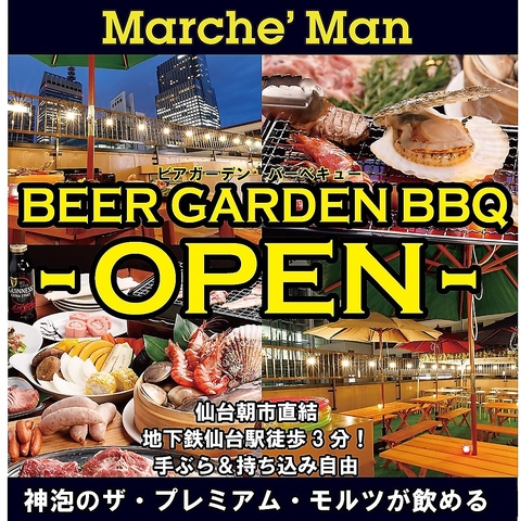 仙台を代表する食の宝箱!!仙台朝市!!その日に水揚げされた魚や良質なお肉は新鮮そのもの!!そんな新鮮素材を生かしてBBQで料理提供!!Marche'Man屋上朝市ビアガーデンがお客様に届ける新鮮素材を数々堪能してもらい幸せな時間をご提供します!!【飲料・食材持ち込み自由】