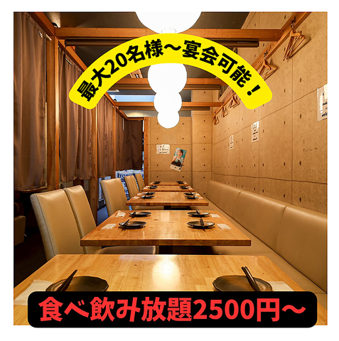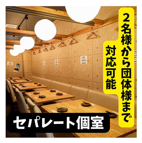 少人数から大人数宴会までご対応可能なセパレート型の個室や、VIP個室まで多彩なお部屋を完備。最大50名様での貸切宴会も承っております。落ち着ける店内を貸し切って、くつろぎのひとときをお過ごしください。会社宴会や接待、女子会にピッタリの2時間飲み放題付プランも多数ご用意しております。
