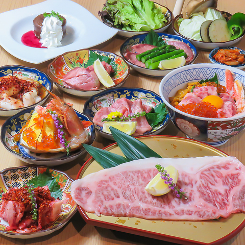 新しく、赤海老北海刺・極上カルビ・本日の海鮮丼・極上カルビ・海鮮丼など最高素材の料理を集めた至極のコースです。2H飲み放題込みでどんな宴会にもおすすめのコースです!