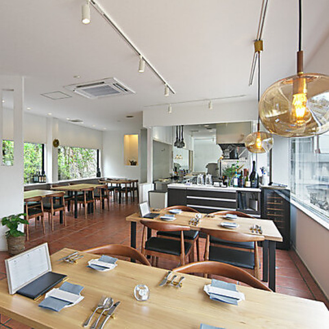 【時間と共に表情を変える空間】ガラス張りで開放感溢れる店内は、時間帯によって異なる表情を見せます。お昼時は爽やかな陽光が差し込み、ランチタイムを明るく演出。夕暮れ時は茜色の空が広がり、ロマンチックな雰囲気に。夜は暖かく店内を包むランプの光が、特別な時間を彩ります。