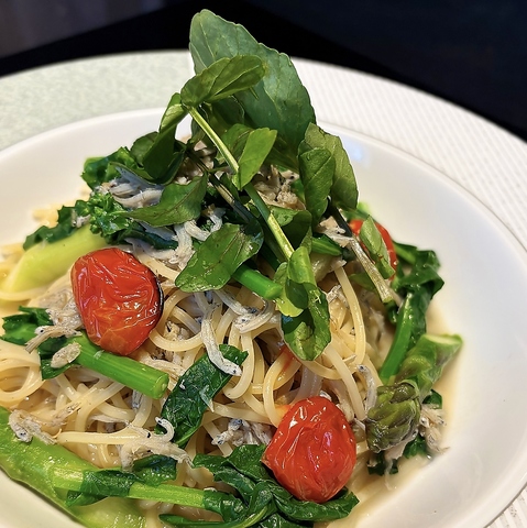 桜海老と万願寺唐辛子、野沢菜のアーリオオーリオ