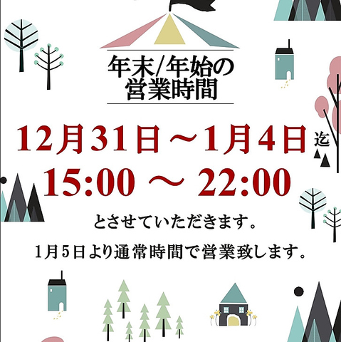 ※12月31日~1月4日迄は、営業時間を15:00~22:00とさせていただきます。