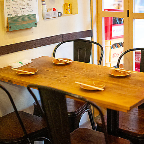 グループ利用に最適なテーブル席は、木の温もりを感じる落ち着いた雰囲気。仲間との飲み会や女子会、ちょい飲みにも◎ワイワイ楽しめるスタイルが好評です。