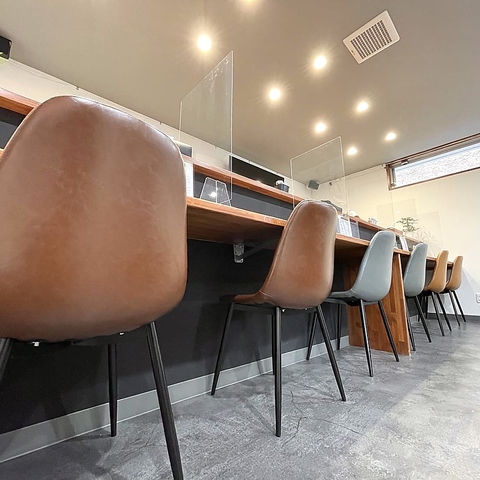 【気軽に立ち寄れるカウンター席】ランチのご利用はもちろん、お仕事帰りの気軽な1杯など、ふらっと立ち寄れるカウンターは全8席。お食事としてラーメンをお楽しみいただくのはもちろん、お酒やお酒にぴったりのおつまみも種類豊富にご用意しておりますので、居酒屋としてご利用いただき、〆のラーメンを楽しむのも◎!