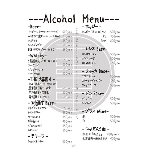 | お酒 | カクテル充実、焼酎充実、日本酒充実 |