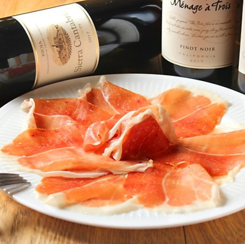 スペイン産豚肉の切りたて生ハム30か月以上熟成された香りと旨味。切りたてでしか味わえない格別な美味しさ。Mサイズ ¥880 /Lサイズ ¥1200