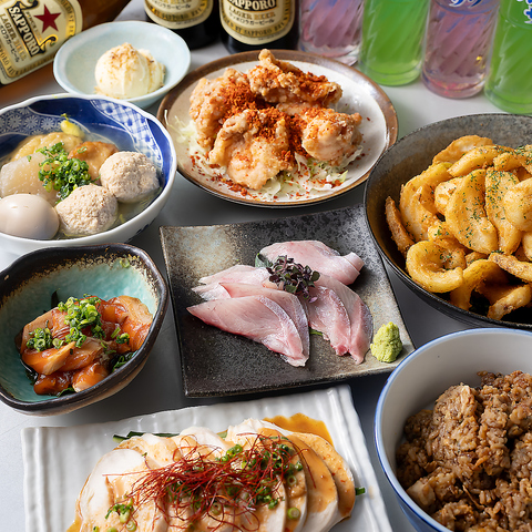 みんなでシェアしやすいお酒にあうおつまみや、当店自慢のおでん盛りや四川スパイシー唐揚げ、デザートまで!宴会向けのコース内容◎2時間飲み放題付きです!(ラストオーダー30分前)※5、6、7名様ですとお席が狭くなります。